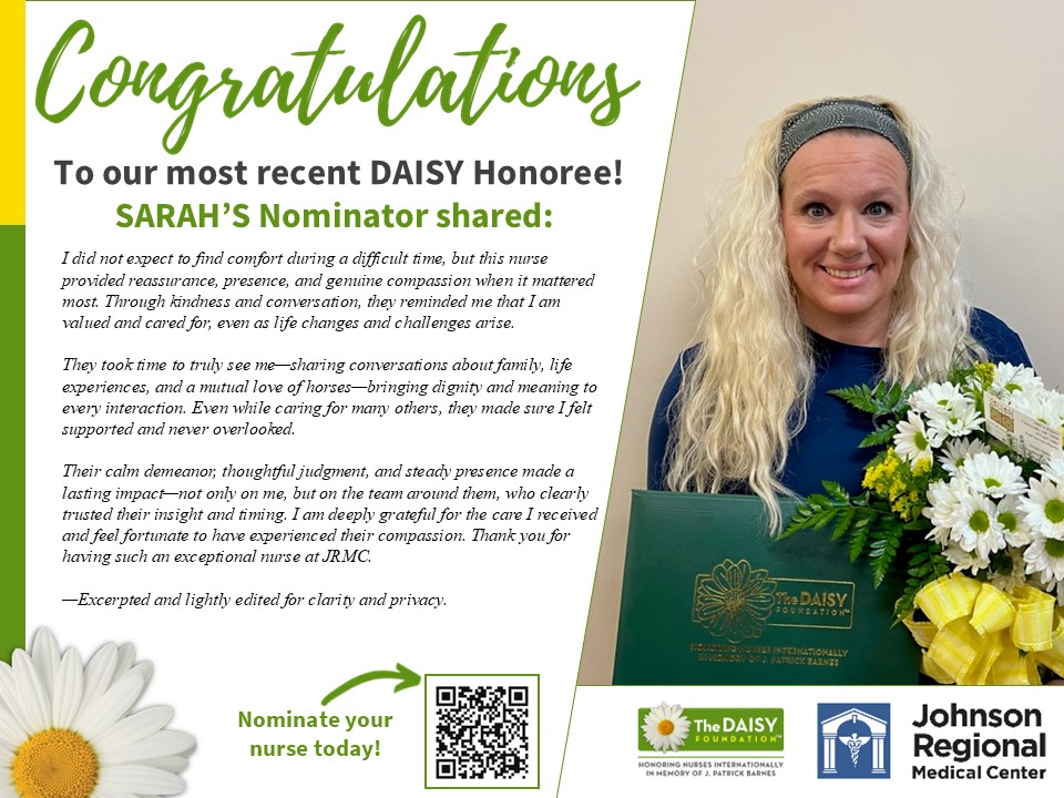 Being honored with the DAISY Award for a second time is a testament to the consistency, heart, and excellence Sarah brings to nursing every day. JRMC is grateful for the difference she makes in the lives of those we serve.
